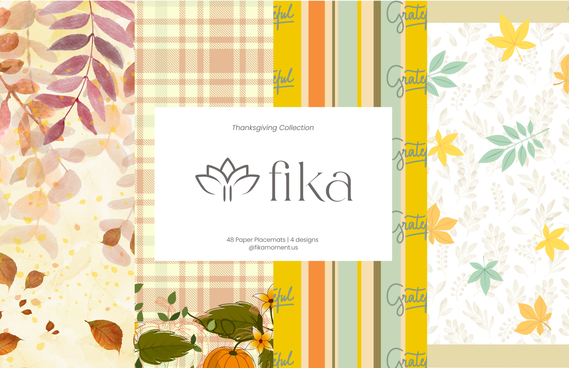 This block includes 48 premium disposable paper placemats, featuring 4 unique designs (12 of each): golden foliage, plaid pumpkins and vines, fall leaves, and grateful stripes in earthy tones.
