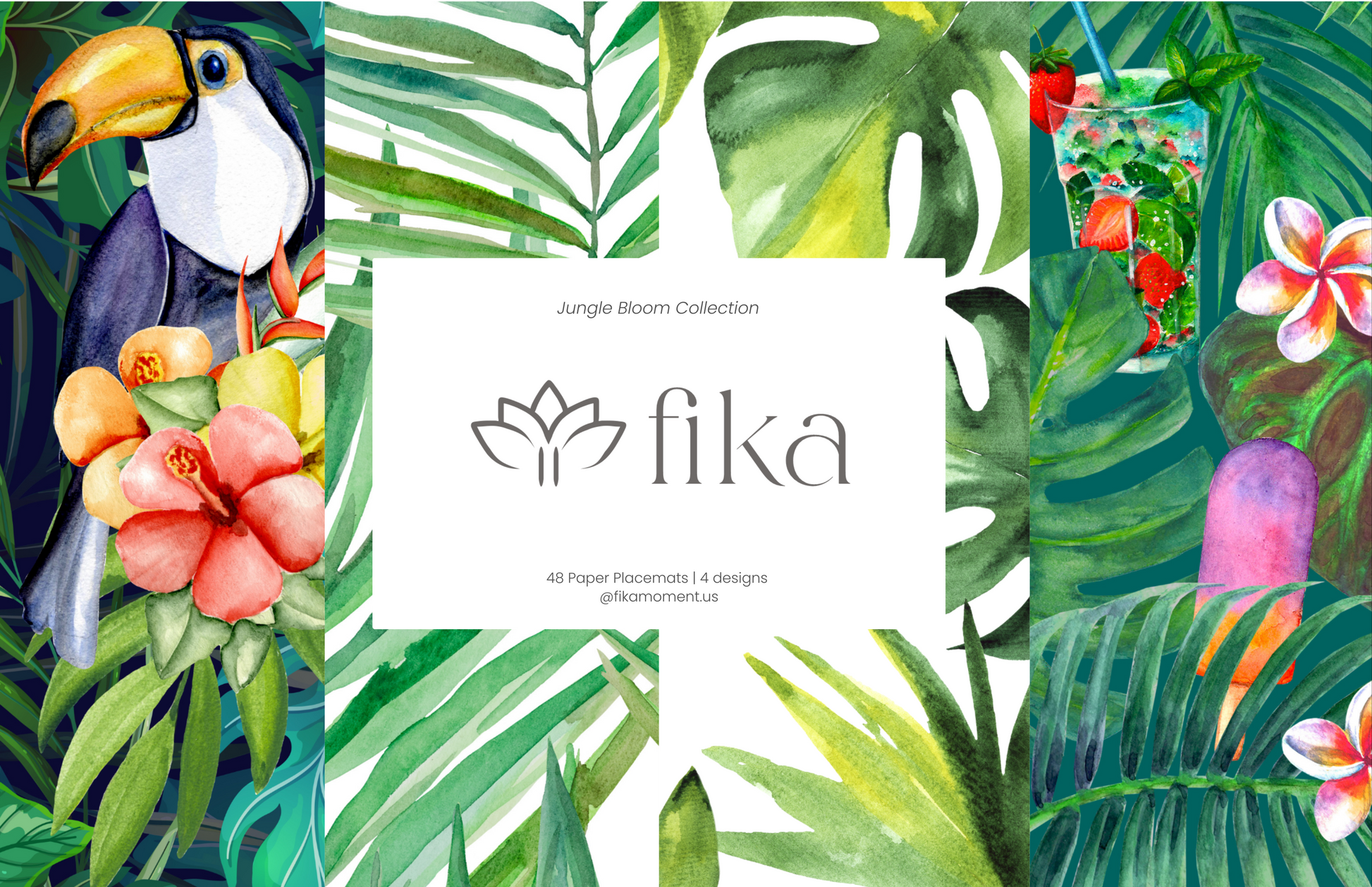 This block includes 48 premium disposable paper placemats, featuring 4 vibrant designs (12 of each), with toucans, mojitos, watercolor palms, and tropical florals in full celebration mode.