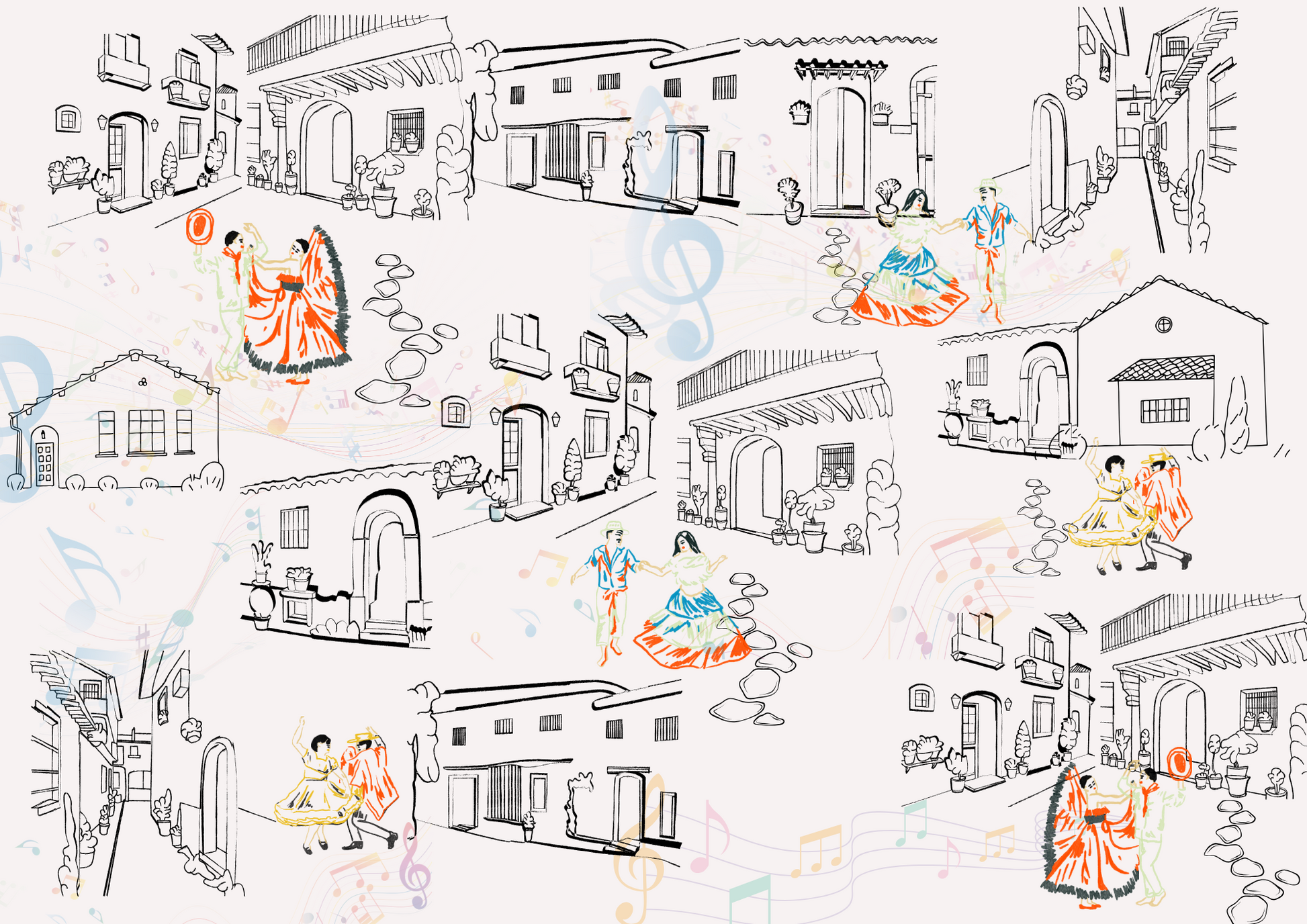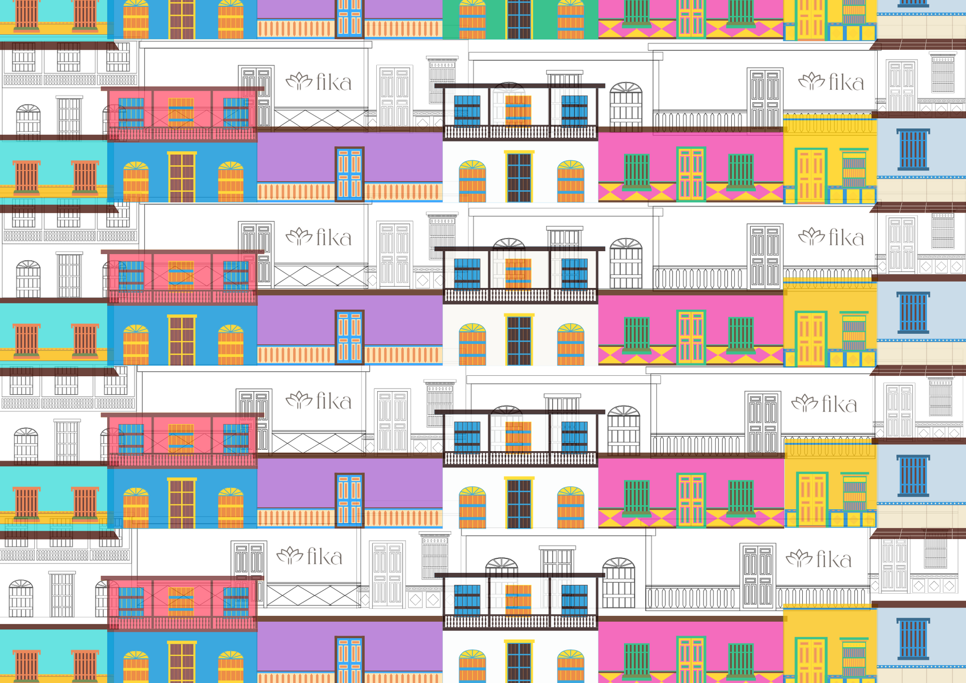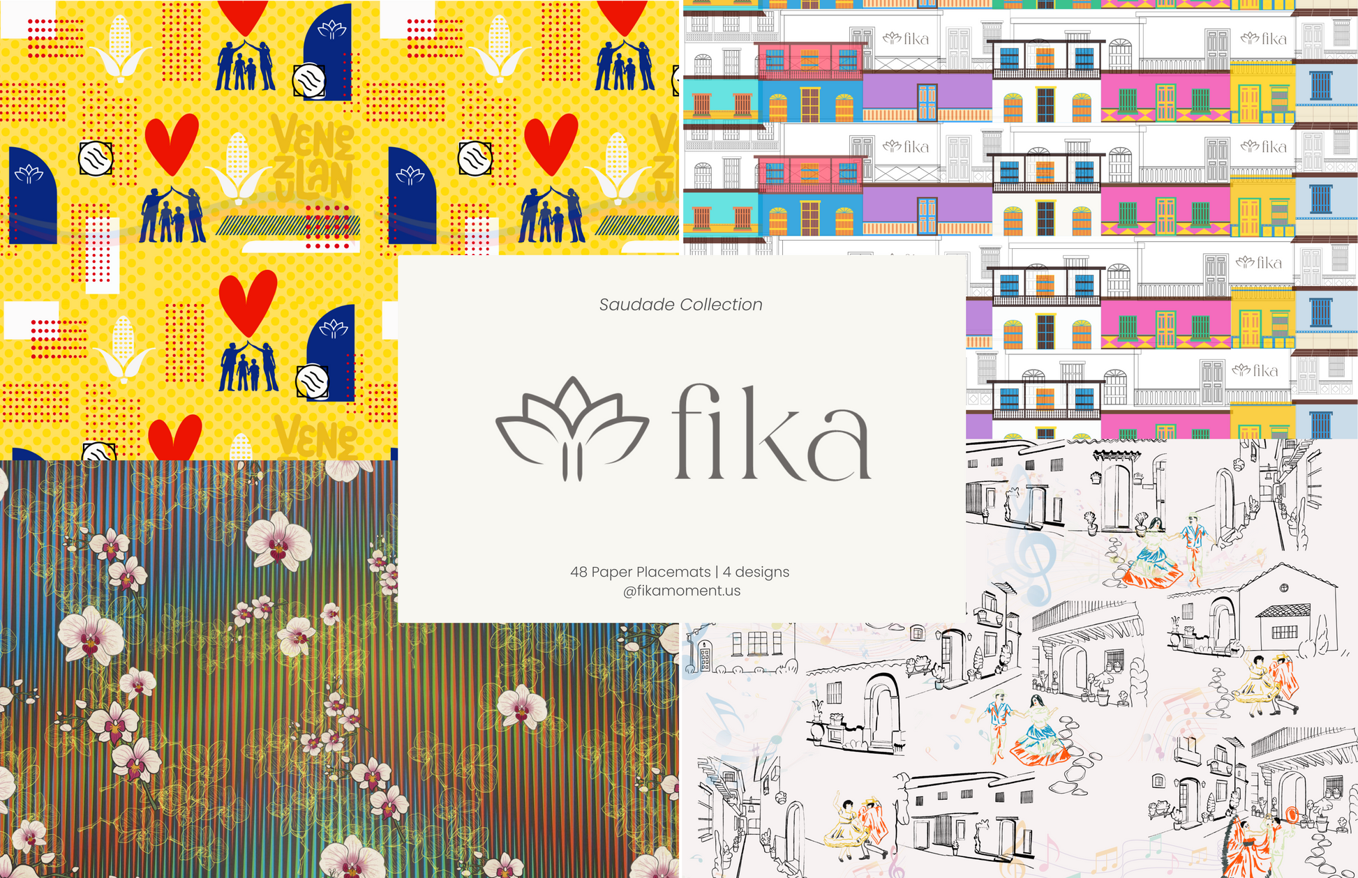 This block includes 48 premium disposable paper placemats featuring 4 distinct designs (12 of each), inspired by Latin American architecture, folklore, and timeless visual rhythm.